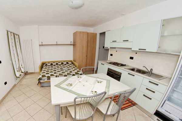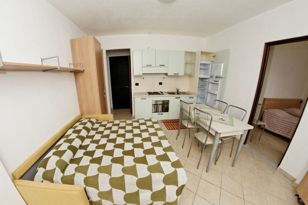 MONOLOCALE 4 PERSONE: Monolocale di circa 30 mq, adatto ad ospitare 4 persone. Composto da soggiorno con divano letto matrimoniale, letto a castello o 2 letti singoli, angolo cottura e bagno. Dispone di vasca da bagno o doccia, TV color, aria condizionata, riscaldamento, frigo con freezer, forno e fornello elettrico con 4 piastre .