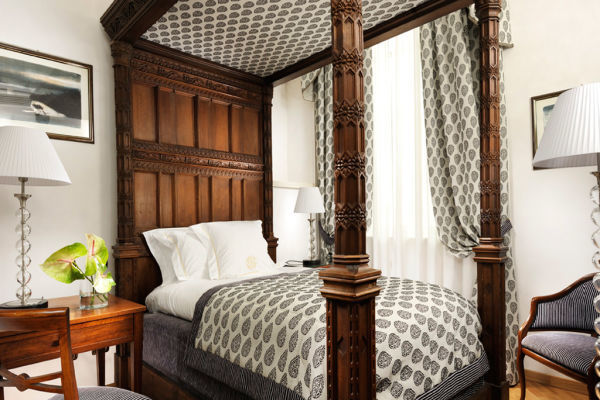 SINGOLA: Stanza luminosa che si affaccia sulla corte interna del Palazzo. Arredata con bellissimi quadri della galleria privata dei Dal Pozzo, è caratterizzata da un confortevole letto alla francese con antico baldacchino ed arredata con scrivania da lavoro, cassettiera e guardaroba. Bagno dotato di doccia walk-in e vasca, oltre ad una gamma completa di accessori e set cortesia.