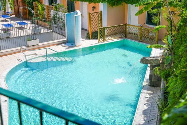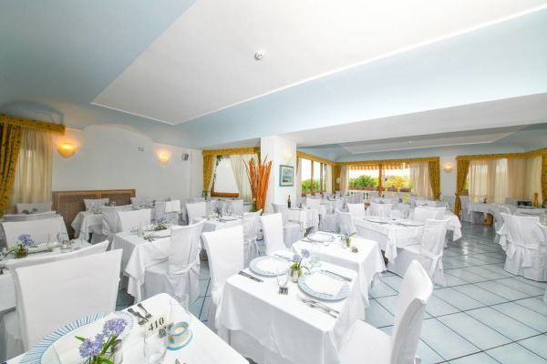 Ristorante climatizzato, particolarmente rinomato per l’ottima cucina regionale, con ampio utilizzo di prodotti tipici locali. Prima colazione a buffet e menu a scelta ai pasti; cena con buffet di antipasti e verdure (su richiesta e senza supplemento, possibilità di cucina senza glutine e vegetariana). Settimanalmente serata con musica. Hall con reception h24, internet point ad accesso libero e Wi-Fi gratuito in tutta la struttura; ascensore, bar e tavernetta. 2 piscine termominerali, di cui una coperta “Iris” ed una esterna Fonte “Grannos”, con idromassaggio, solarium attrezzato e terrazze elioterapiche con vista panoramica sul golfo di Napoli. Servizio navetta da/per il centro e la spiaggia ad orari prestabiliti. Su richiesta e a pagamento: possibilità di noleggio accappatoio, servizio baby sitting e servizio lavanderia. Parcheggio comunale, non custodito, a ca. 10 m. Animali ammessi di piccola taglia (escluse aree comuni).Durante la cena è obbligatorio, per gli uomini, indossare un pantalone lungo. Servizio spiaggia incluso per min. 7 notti dal 26/05 al 01/08 e dal 01/09 al 26/09 con ombrellone e sdraio (dal lunedì al venerdì).