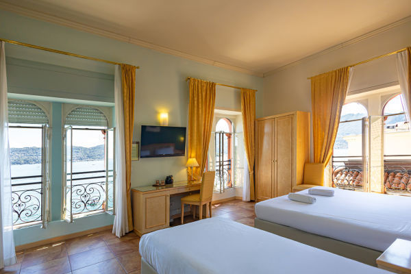 DOPPIA SUPERIOR VISTA LAGO LATERALE: Una sistemazione raffinata e accogliente, di circa 16 mq, situata ai piani superiori dell’hotel, con vista parziale sul Lago Maggiore grazie a una finestra laterale o a un balconcino. L'arredamento è in stile classico ed elegante, con pavimenti in legno o ceramica. Dispone di bagno privato, aria condizionata, TV, wi‑fi, minibar, cassaforte e prodotti per il bagno, con accappatoio e pantofoline.