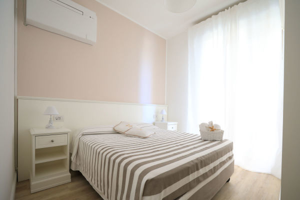 QUADRUPLA COMFORT VISTA MARE: Camera doppia o matrimoniale con aggiunta di terzo e quarto letto ed una splendida vista mare, completamente ristrutturata e caratterizzata da arredi dalle tonalità avvolgenti, soffici tendaggi dai colori chiari in stile shabby chic. Dispone di aria condizionata, wi-fi, cassaforte, Tv color, telefono.