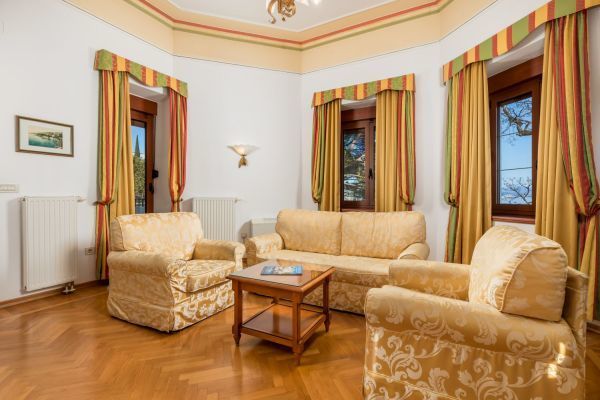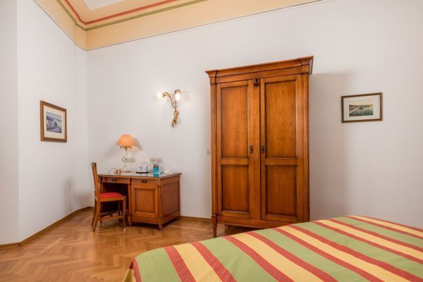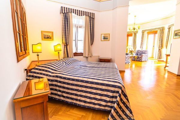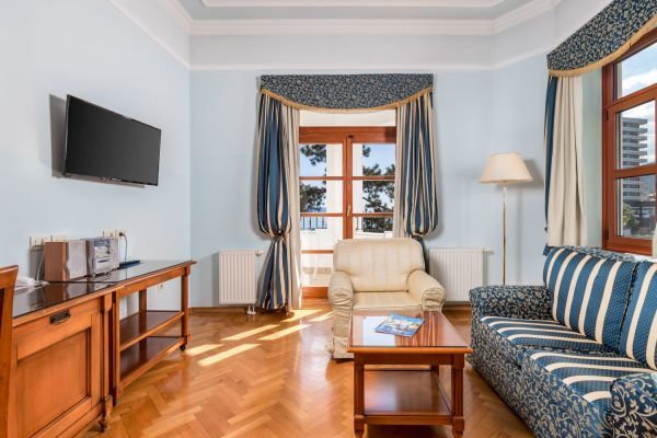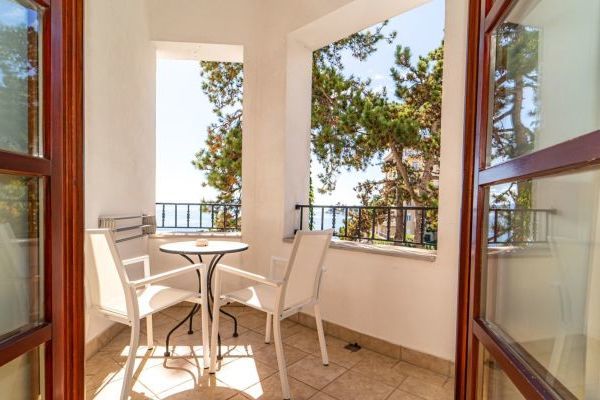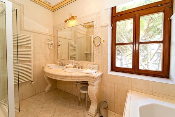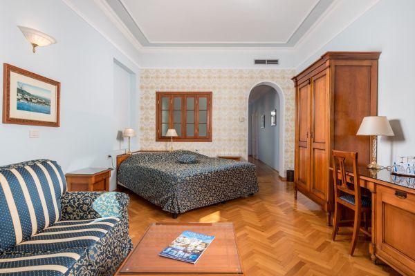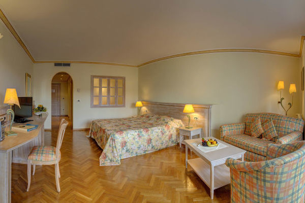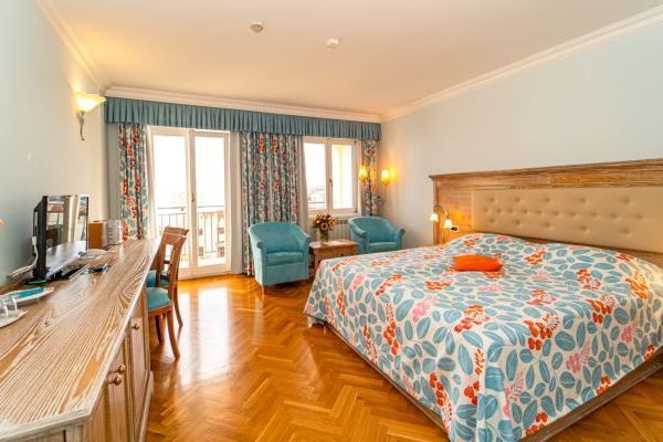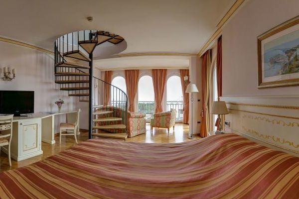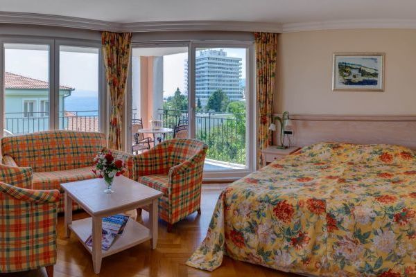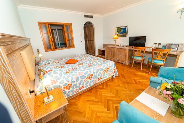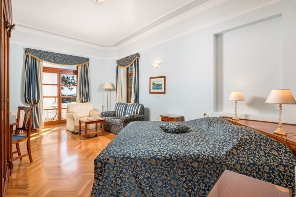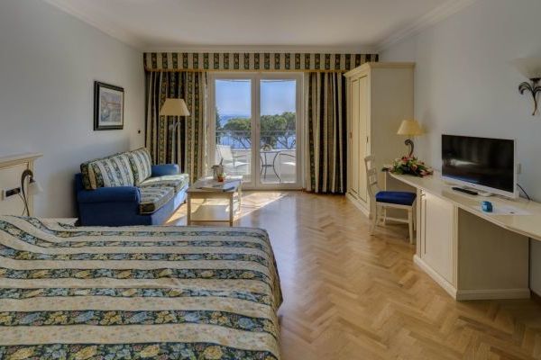 Tutte le camere hanno il pavimento in parquet e sono dotate di bagno con doccia, asciugacapelli, accappatoio, aria condizionata, telefono, TV satellitare, Wi-Fi, minibar e cassaforte. Camera doppia superior: con balcone/loggia lato terra. 25-30 mq Camera doppia Premium Park: con balcone/loggia con vista sul parco. 30-35 mq. Camera doppia superior lato mare: con balcone/loggia vista mare. 25-35 mq. Camera doppia Premium vista mare: con balcone/loggia con vista mare. 30-35 mq. Camera doppia Superior Plus vista mare: con balcone/loggia vista mare. 35 mq. Appartamento familiare: con camera da letto separata e balcone/loggia con vista mare. 50 mq. Camera doppia deluxe vista mare: con balcone/loggia vista mare. 40 mq. Camera doppia fronte mare vista mare: con balcone/loggia vista mare. 35 mq. Executive Suite vista mare: situata nella Villa Neptun, con balcone e vista mare di 60 mq. Suite Belvedere vista mare: con vista mare e terrazza panoramica con vasca idromassaggio, 60 mq. Wellness Suite vista mare: con vista mare e terrazza panoramica con idromassaggio, nella torre di Villa Neptun. 80 mq.