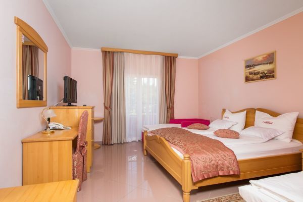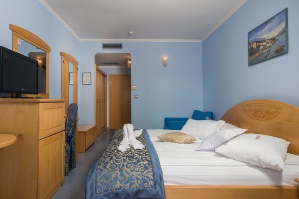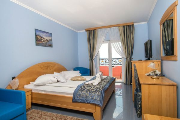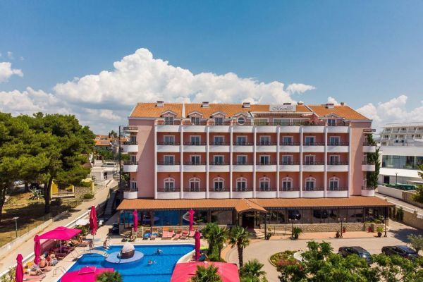 Situato a est del centro della famosa destinazione turistica di Vodice, l'Hotel Miramare vi conquisterà con la sua posizione fronte mare, nonché con la sua eleganza e il suo fascino. In dieci minuti a piedi raggiungerete il centro di Vodice, dove troverete tutto il necessario per una vacanza indimenticabile. Vodice si trova sulla costa adriatica, 11 km a nord-ovest di Sebenico, capoluogo della Contea di Sebenico e Tenin. Un'autostrada vicina e due aeroporti, uno a Spalato e l'altro a Zara, vi porteranno in pochissimo tempo alla vostra destinazione, l'Hotel Miramare di Vodice. L'Hotel Miramare, quattro stelle, offre sistemazione in 61 eleganti camere con balcone che si affaccia sulla spiaggia vicino all'hotel o sul parco dell'hotel. La splendida piscina con acqua cristallina è il luogo ideale per trascorrere un pomeriggio o anche un'intera giornata. Rilassatevi comodamente su una sdraio sorseggiando una bibita fresca. Nella splendida atmosfera del ristorante dell'hotel potrete gustare piatti deliziosi e preparati con cura. Il ristorante può ospitare fino a cento persone e offre una ricca colazione a buffet al mattino. La moderna caffetteria dell'hotel vi regalerà momenti di relax pomeridiani gustando caffè italiano di alta qualità, vini, cocktail e altre bevande.