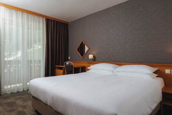 Le 118 camere a quattro stelle offrono tutto il necessario per una vacanza rilassante: Wi-Fi, box doccia, WC, TV via cavo e radio, minibar e telefono con linea diretta. Potrete vivere un'esperienza unica con la vista pittoresca di Kranjska Gora mentre fate un tuffo nel parco acquatico con finestre panoramiche proprio accanto alla pista da sci. Camera doppia o matrimoniale: con due letti separati (90x210 cm) o un letto king size (180x200 cm) e bagno con vasca o doccia. Camere con vista sulle montagne con supplemento. Camera matrimoniale o doppia con letto aggiunto: con due letti separati (90x210 cm) o un letto king size (180x200 cm) e bagno con vasca o doccia. È possibile aggiungere un letto supplementare per un bambino. In questo caso, la superficie libera di una camera matrimoniale potrebbe essere ridotta di conseguenza e quindi la circolazione all'interno della camera potrebbe essere limitata. Camera familiare: con camera da letto separata e soggiorno con divano.