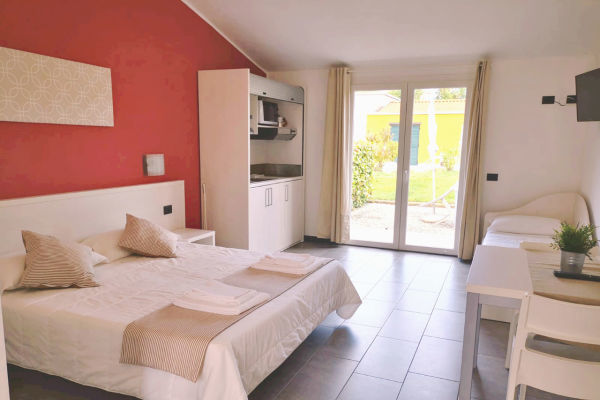 MONOLOCALE 4 PERSONE CON GIARDINO: Studio per 2 adulti e 2 bambini di circa 32 mq, con giardino, soggiorno con letto matrimoniale, divano letto con estraibile, armadio, appendiabiti, angolo cottura in ceramica, bagno con doccia, prodotti da bagno.