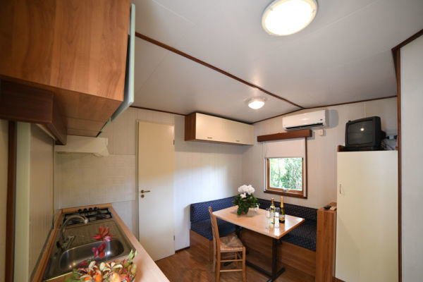 MOBILHOME B 2/3 PERSONE: Chalet-mobilhome per 2 persone e 1 bambino, di circa 24 mq. Composto da soggiorno con divano letto (cm 180) e angolo cottura dotato di fornelli a gas con 4 fuochi e frigorifero con congelatore, camera matrimoniale, camera doppia, bagno con doccia e WC, spazio esterno attrezzato. Aria condizionata e riscaldamento. Spazio esterno attrezzato con sedie o panche piu tavolo. Posteggio riservato di fianco alla struttura.