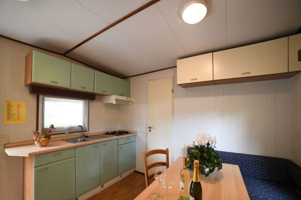 MOBILHOME - TIPOLOGIA C 5 PERSONE: Chalet-mobilhome per 4/5 persone di circa 30 mq. Composto da soggiorno con angolo cottura dotato di fornelli a gas con 4 fuochi e frigorifero con congelatore, camera matrimoniale, camera con un letto a castello e un letto singolo o 3 singoli. Due bagni (uno con doccia e WC e uno solo con WC), spazio esterno attrezzato. Aria condizionata e riscaldamento. Spazio esterno attrezzato con sedie o panche più tavolo. Posteggio riservato di fianco alla struttura.