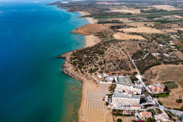 Ampia spiaggia di sabbia dorata con accesso diretto dalla struttura, attrezzata con lettini ed ombrelloni a disposizione degli ospiti. All'interno di una piccola baia, con fondale degradante, particolarmente adatta per i bambini. Possibilità di noleggio teli mare.