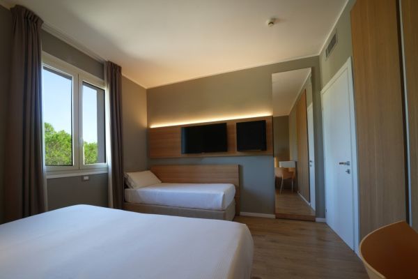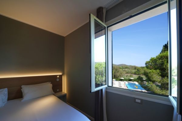 Le 145 camere sono distribuite all’interno della pineta e offrono soluzioni diverse per ogni esigenza. Tutte includono ingresso indipendente, aria condizionata, TV, cassaforte, servizi con box doccia, asciugacapelli e frigobar (riempimento su richiesta). Alcune tipologie dispongono di patio o balcone.